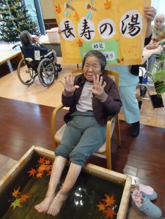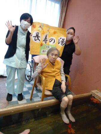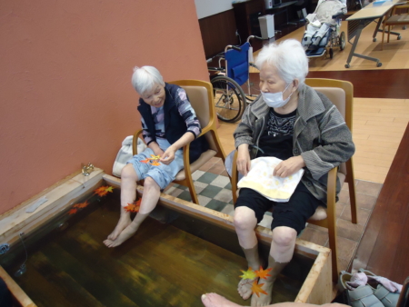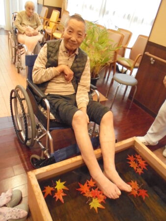2025年11月13日 R7.11 足湯で美肌 秋風が心地よい季節になりました。 美肌、若返りの効能がある知る人ぞ知るプラタナスの 長寿の湯で足湯を楽しみました。 ‘ ‘ ‘ ‘ 少しづつ色づき始め赤、黄、緑と様々な紅葉を スロープまで出て楽しみました。 ‘ ‘ ‘ お部屋の中でも柿や栗。秋の雰囲気を存分に味わいました。 ‘ ‘ 足湯に浸かってお肌ツルッツル(o^―^o)ニコ おいしい和菓子も頂いて秋を楽しむ一日となりました。 ‘ ‘ ‘