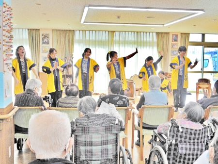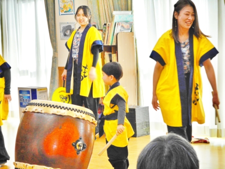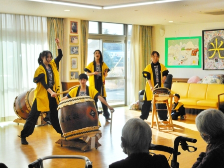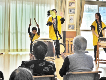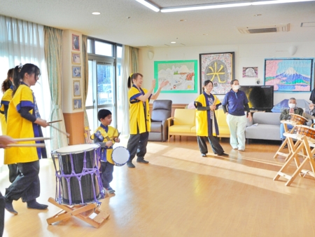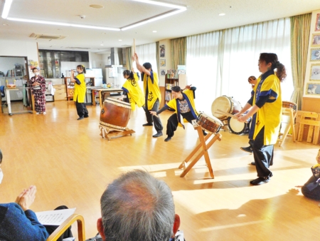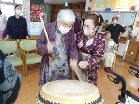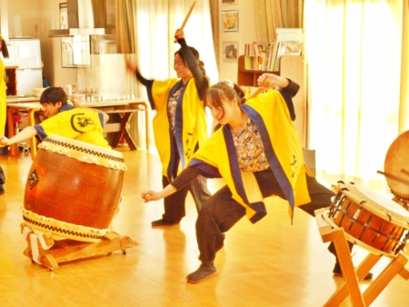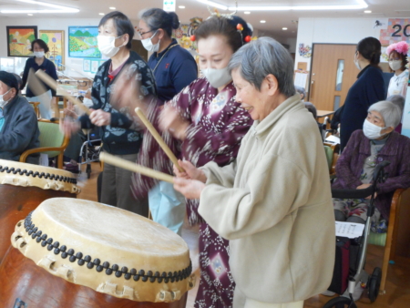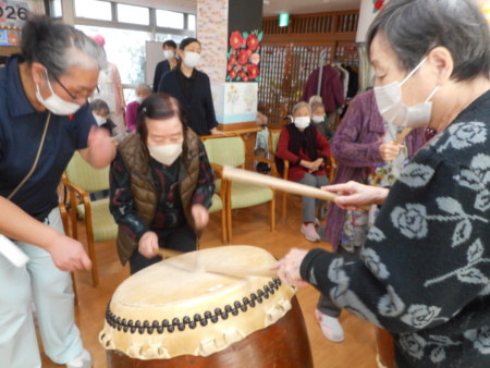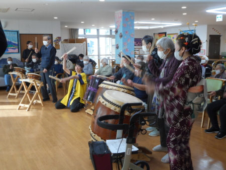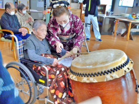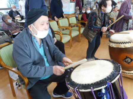 このあと太鼓を叩いてみませんかとのお誘いに、デイサービスの利用者の方も入所者のみなさんも叩いてみました。